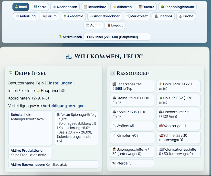 Die Entwicklung von Inselkampf war eine spannende Reise, die strategisches Denken mit technischem Know-how und kreativem Design vereint hat. Mit dem neuen Admin-Bereich und der umfassenden Spielanleitung ist das Spiel dynamischer, leichter zu verwalten und zugänglicher für Spieler. Ich bin stolz darauf, ein Spiel geschaffen zu haben, das Herausforderungen und Spaß bietet. Tauche ein in die Welt von Inselkampf, baue dein Reich auf und erobere die Meere!