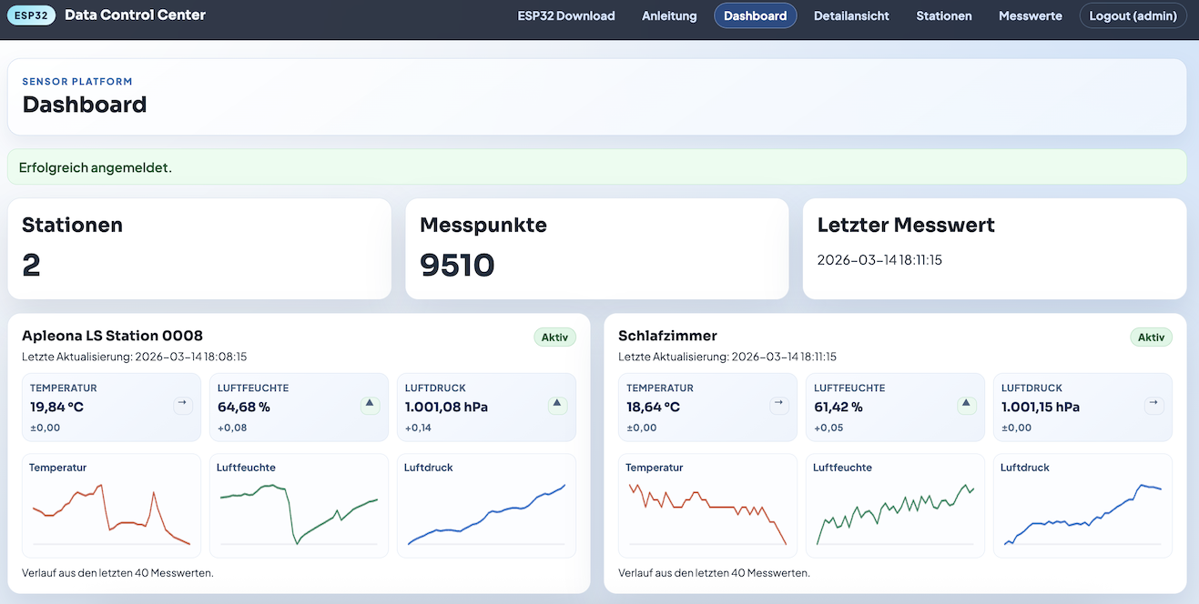 Mit diesem Projekt ist eine kleine, aber erstaunlich vielseitige Sensorplattform entstanden, die auf ESP32-Mikrocontrollern basiert und Umweltdaten wie Temperatur, Luftfeuchtigkeit und Luftdruck zentral in ein Webportal uebertraegt. Ziel war es, eine Loesung zu bauen, die nicht nur Messwerte speichert, sondern im Alltag wirklich praktisch ist: Stationen koennen im Portal angelegt, benannt und verwaltet werden, Firmware-Updates lassen sich zentral steuern und auch der Betrieb mit DeepSleep oder bei kurzzeitigem WLAN-Ausfall wurde beruecksichtigt. Besonders spannend war fuer mich die Kombination aus Hardware, Firmware, PHP-Backend und Weboberflaeche, weil dadurch ein geschlossenes System entstanden ist, das sich lokal testen und spaeter direkt auf einem Webserver betreiben laesst.