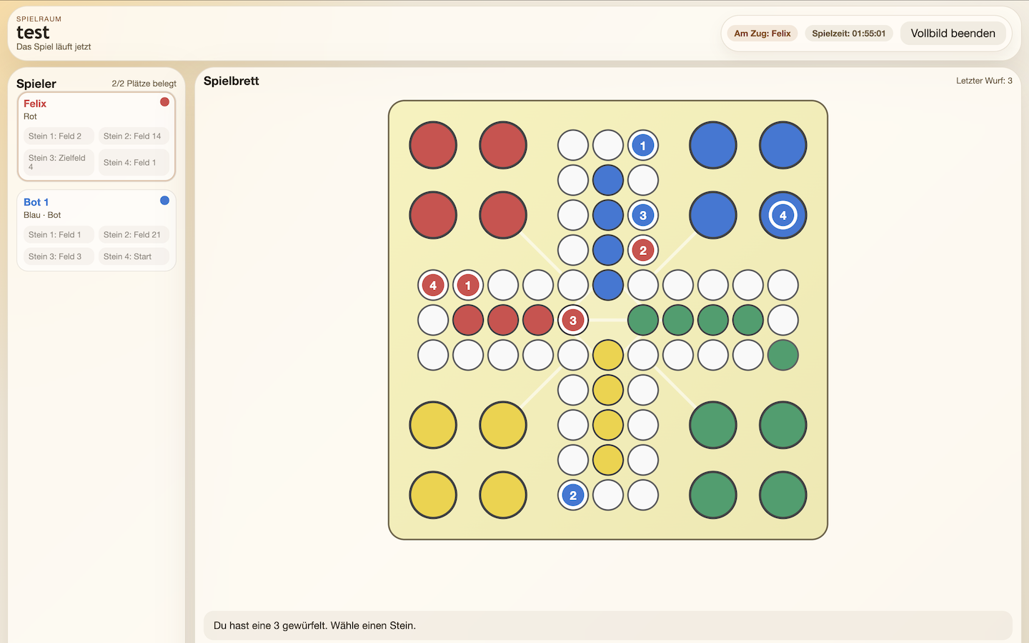 - Nachvollziehbarkeit der Züge: Gerade bei Bots oder mehreren schnellen Zustandswechseln kann ein Browser-Spiel unübersichtlich werden. Das wurde mit kurzen Zuganimationen, Sounds, einem Würfel-Flash und einem Log der letzten Aktionen gelöst.